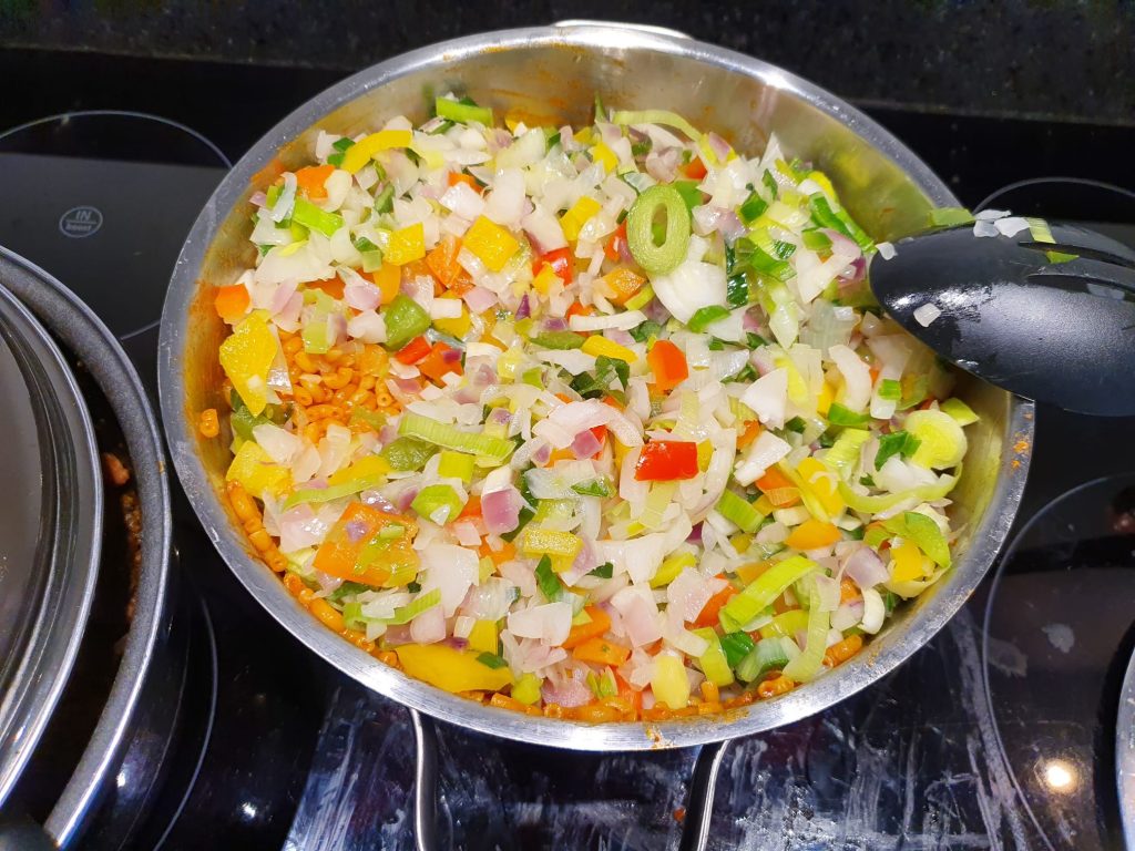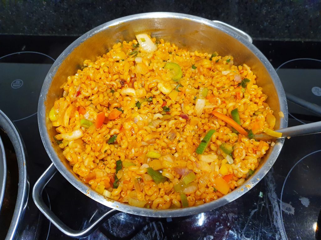 Doe er ook even een flinke scheut olijfolie bij, gooi nu de macaroni in de grote pan en meng het goed met de mixen en olijfolie. Donder nu de groente door de macaroni.