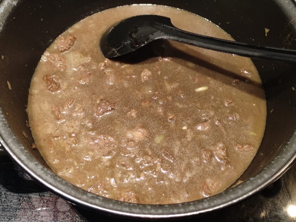 Waarom het water niet te laten koken? Als je kokend water bij het vlees in knettert dan wordt het vlees droog. Daarom dus dude. Laat de runderstoofpot nu 2 uur stoven op laag vuur, niet laten koken dus!