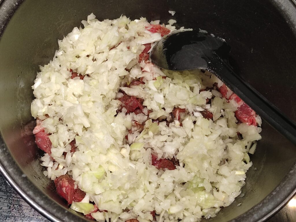 Oke, pleur de uien bij het vlees in en bak ff 1 minuutje aan.