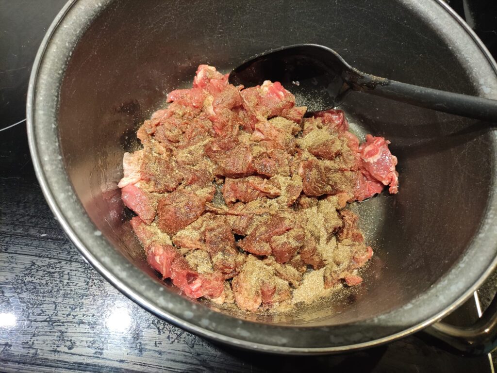 Het kan ook met peper, zout, kruidnagel of wat je voorkeur ook is kwa kruiden. Kaneel gaat er ook goed bij. In ieder geval het vlees goed kruiden, en daarmee bedoel ik: Niet te zuinig met de zooi.