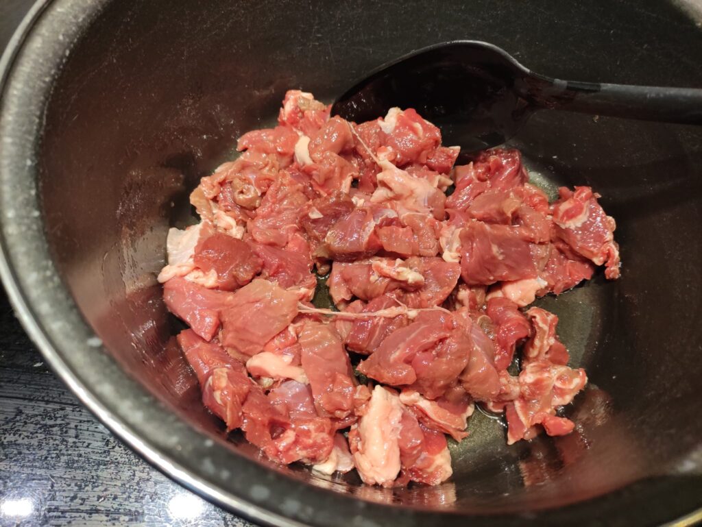 Snijd de rundvleeslappen in kleine stukjes, pak een emaille pan met een dikke bodem en doe er een scheut olijfolie in. Een braadpan met dikke bodem houdt beter de warmte vast en is zeer geschikt om rundvlees in te garen.